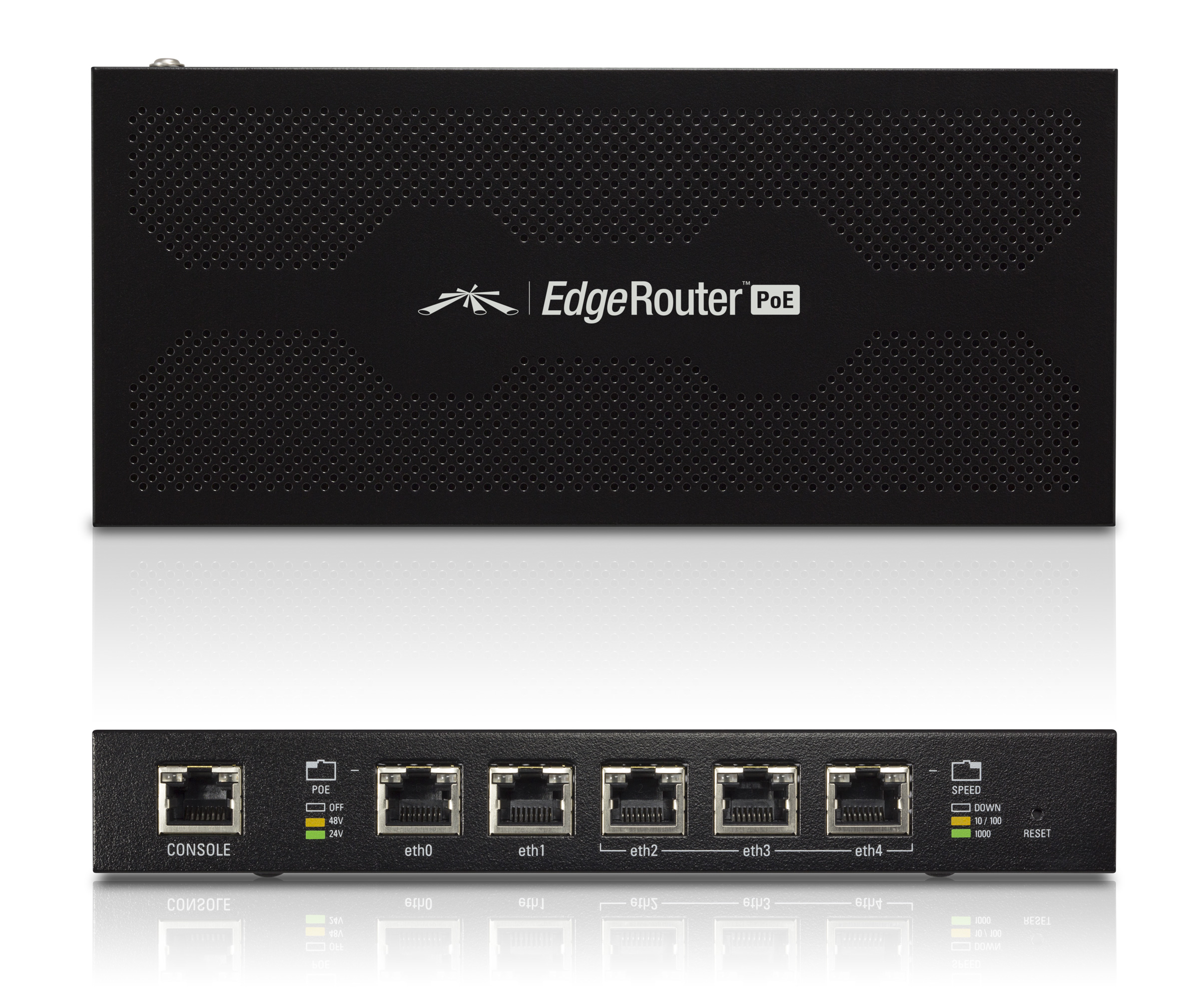 Ubiquiti EdgeRouter PoE is a newest product in Ubiquiti EdgeMax line. ERPOE-5 is a five ports Gigabit Ethernet router with passive PoE capability on all of its ports. Router has 500MHz Dual-core CPU with packet forwarding acceleration which allows to achieve at last 1M pps. Router works under a feature-rich EdgeOS operating system equiped with powerful, intuitive graphical user interface. Software supports as well basic network functionality as more advanced features like OSPF and BGP routing (also for IPv6) or IPSec encryption. Main features