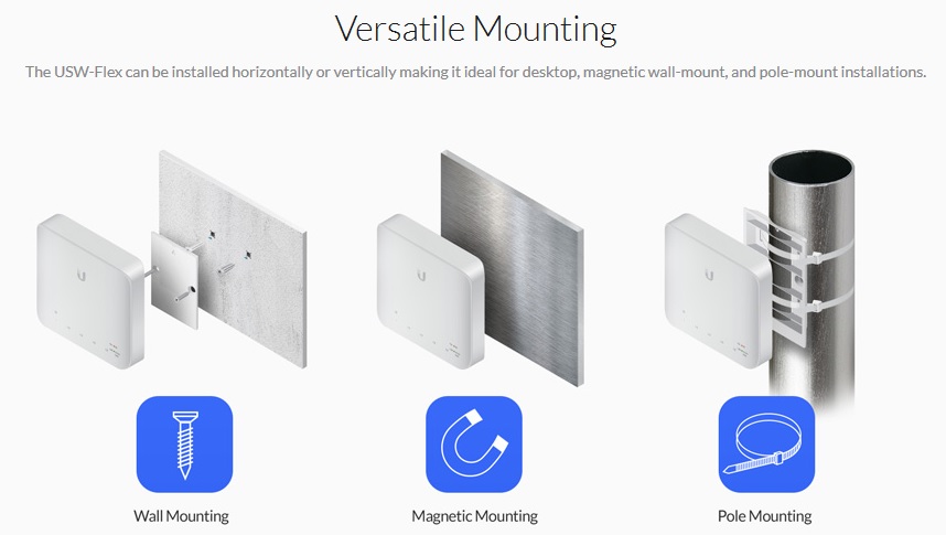 The USW-Flex can be installed horizontally or vertically and is designed for indoor and outdoor use, making it ideal for desktop, wall, and pole-mount installations. With its weatherproof housing and versatile mounting options, the USW-Flex provides the flexibility and durability in environments with extreme temperature variations.
